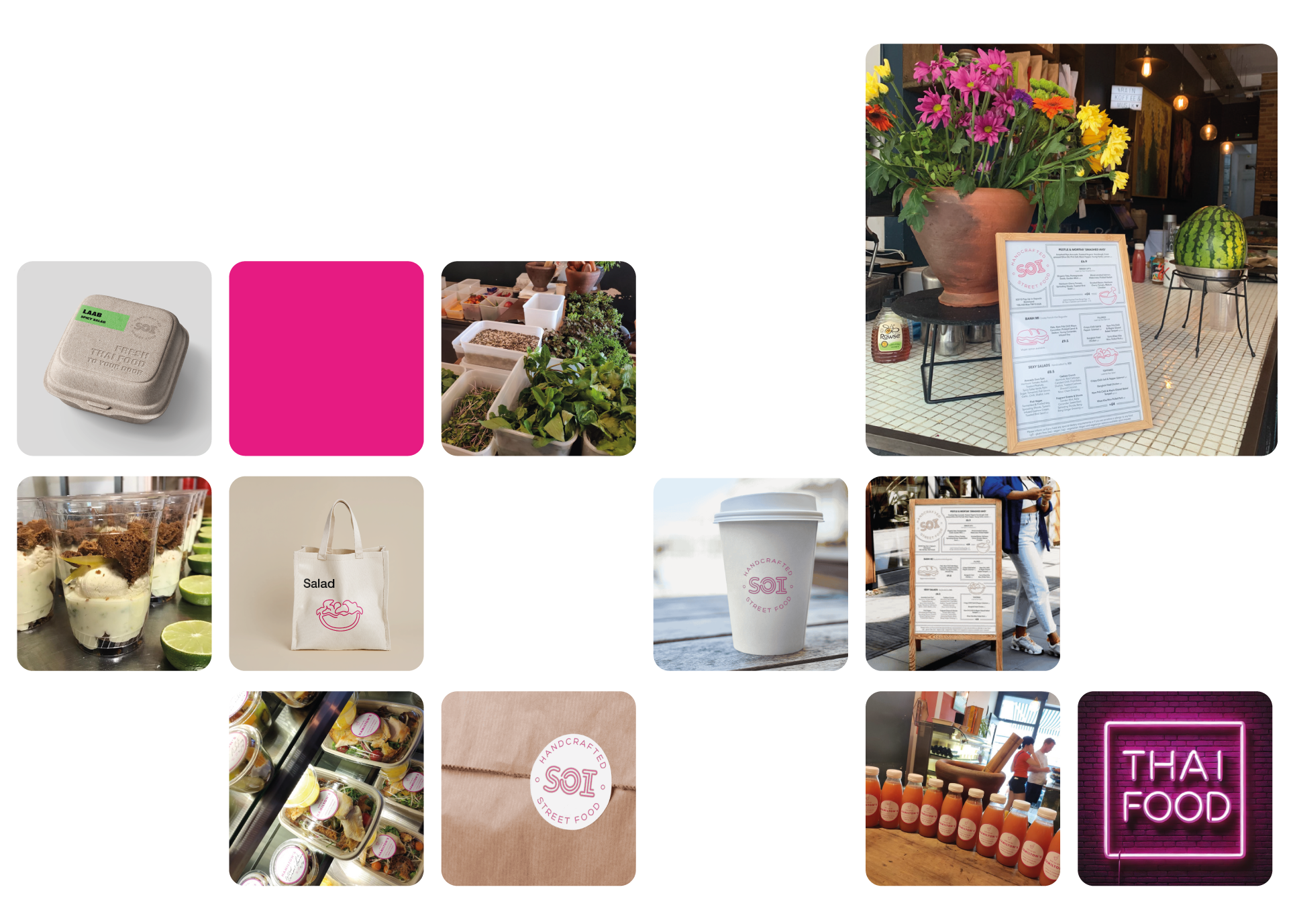 The colour palette centred on an electric magenta contrasted with crisp white—punchy enough to compete with a colourful café interior, distinctive enough to be memorable. This wasn't arbitrary; the high-contrast scheme ensured legibility across all applications whilst capturing that neon-lit Bangkok energy.
